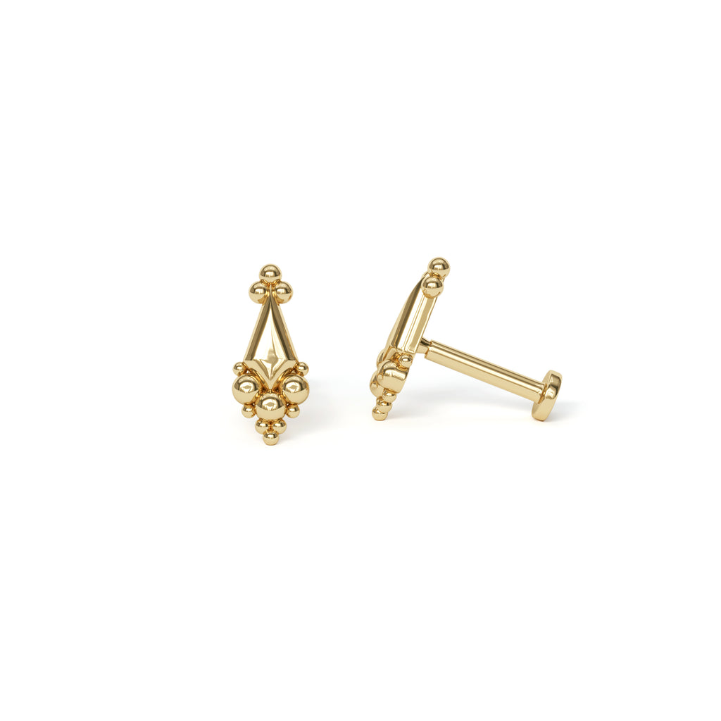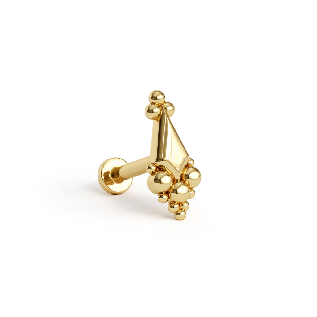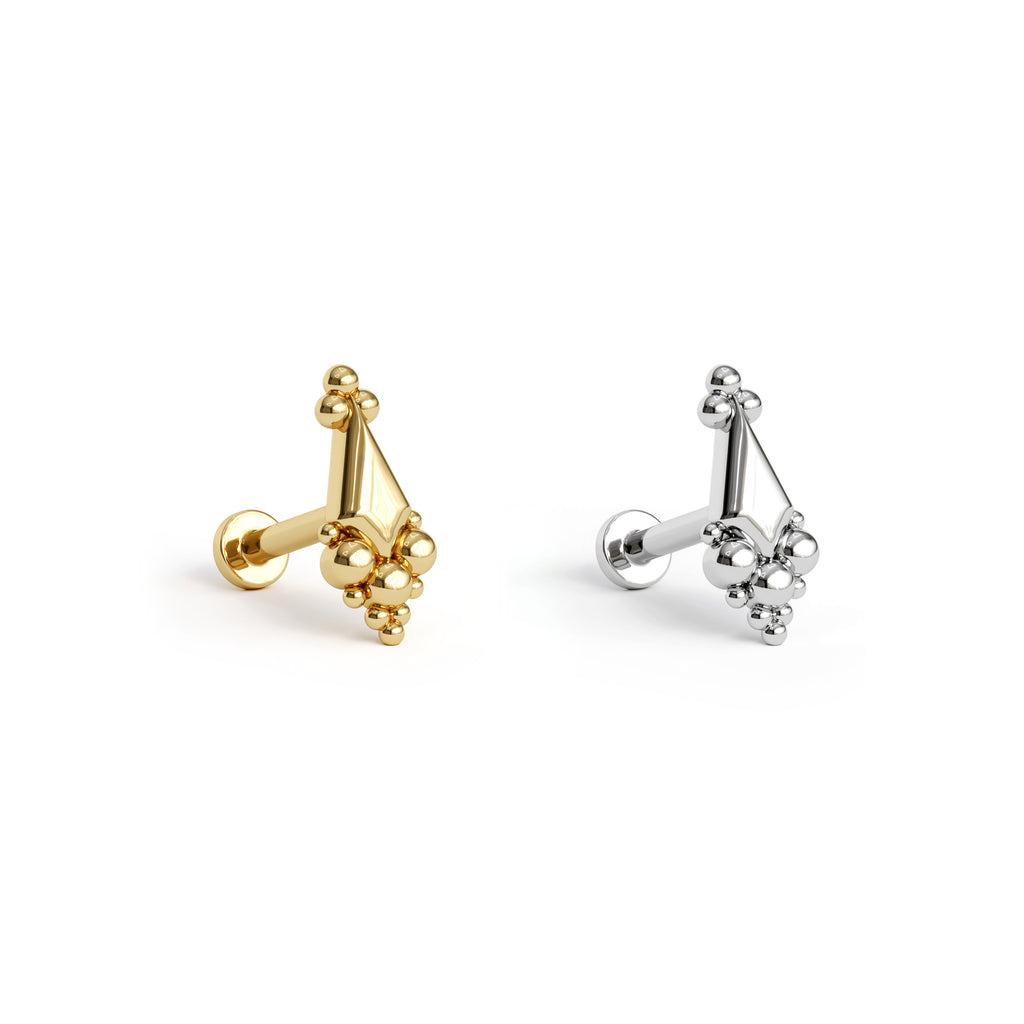A beautiful flat back stud earring to add to your cartilage. With a unique rhombus design and beaded accents, this unique stud is crafted from 14k solid gold. It's minimalist and totally chic. You'll love wearing it!